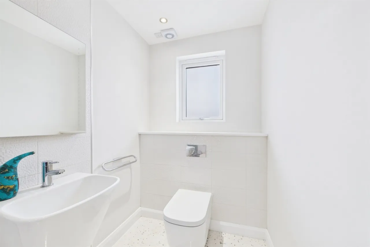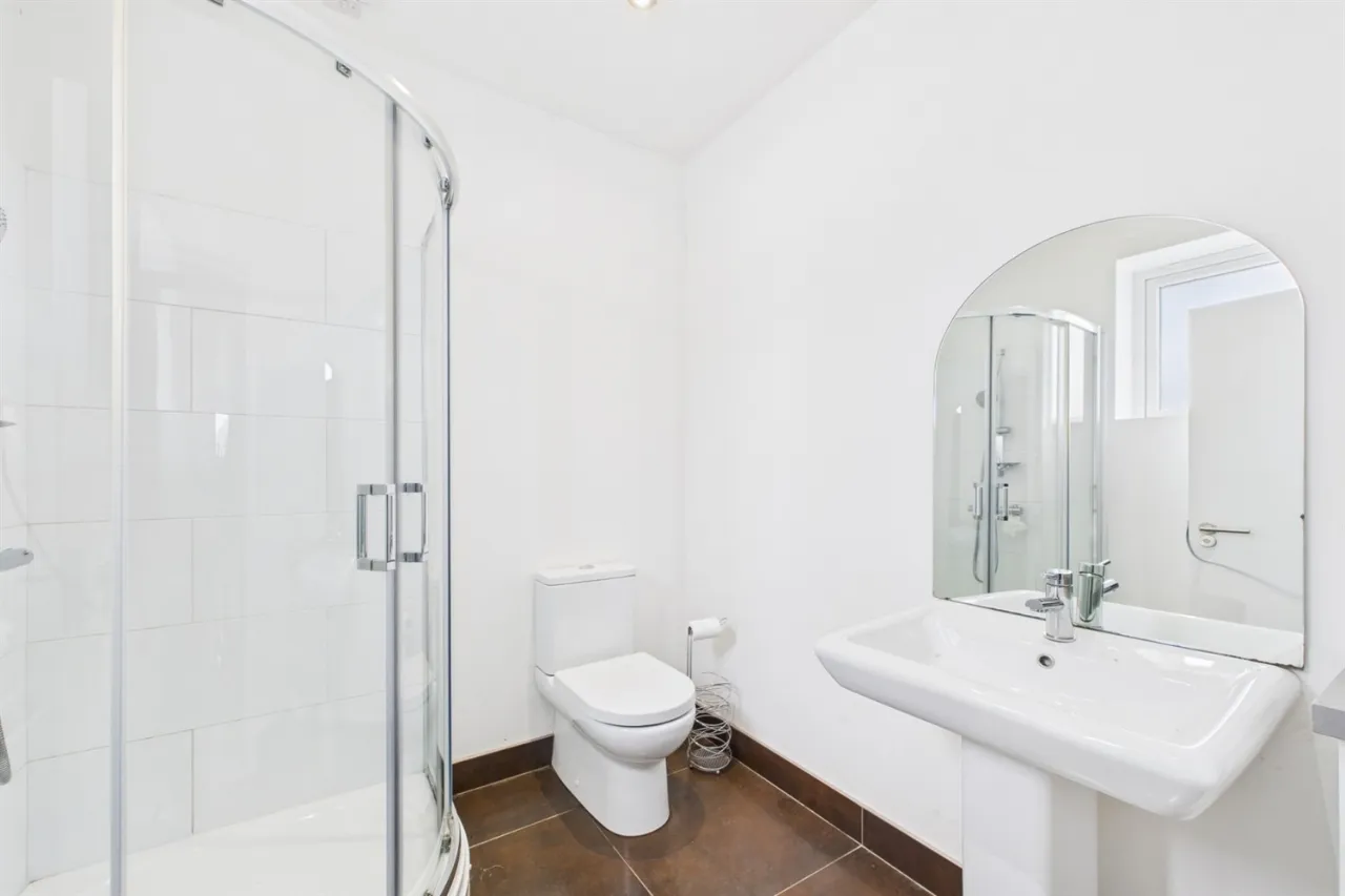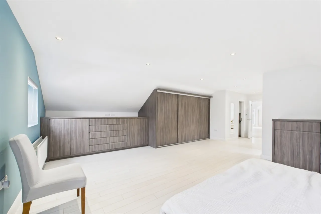 Upstairs comprises a large open-plan landing with balcony and two double bedrooms, both benefiting from ensuite bathrooms.