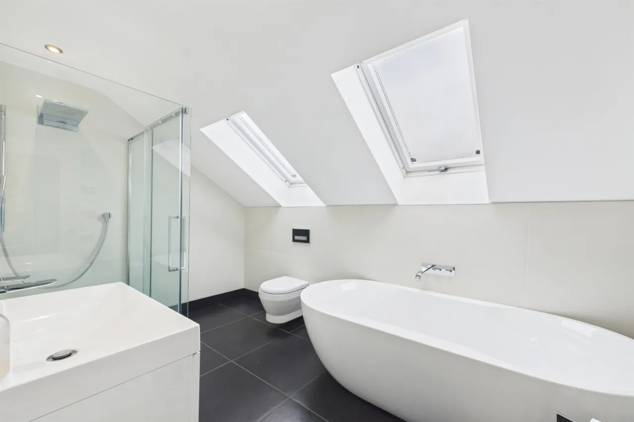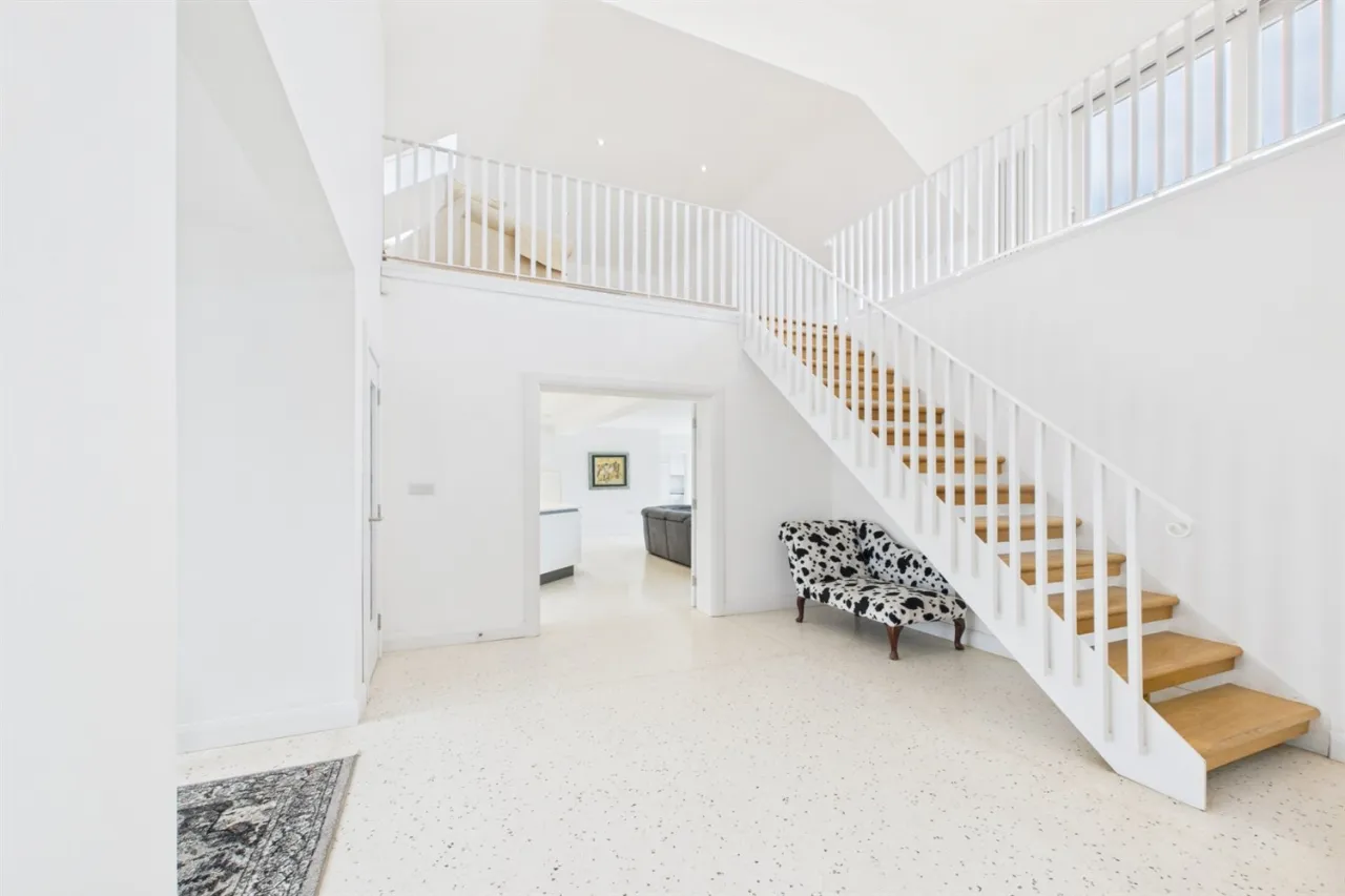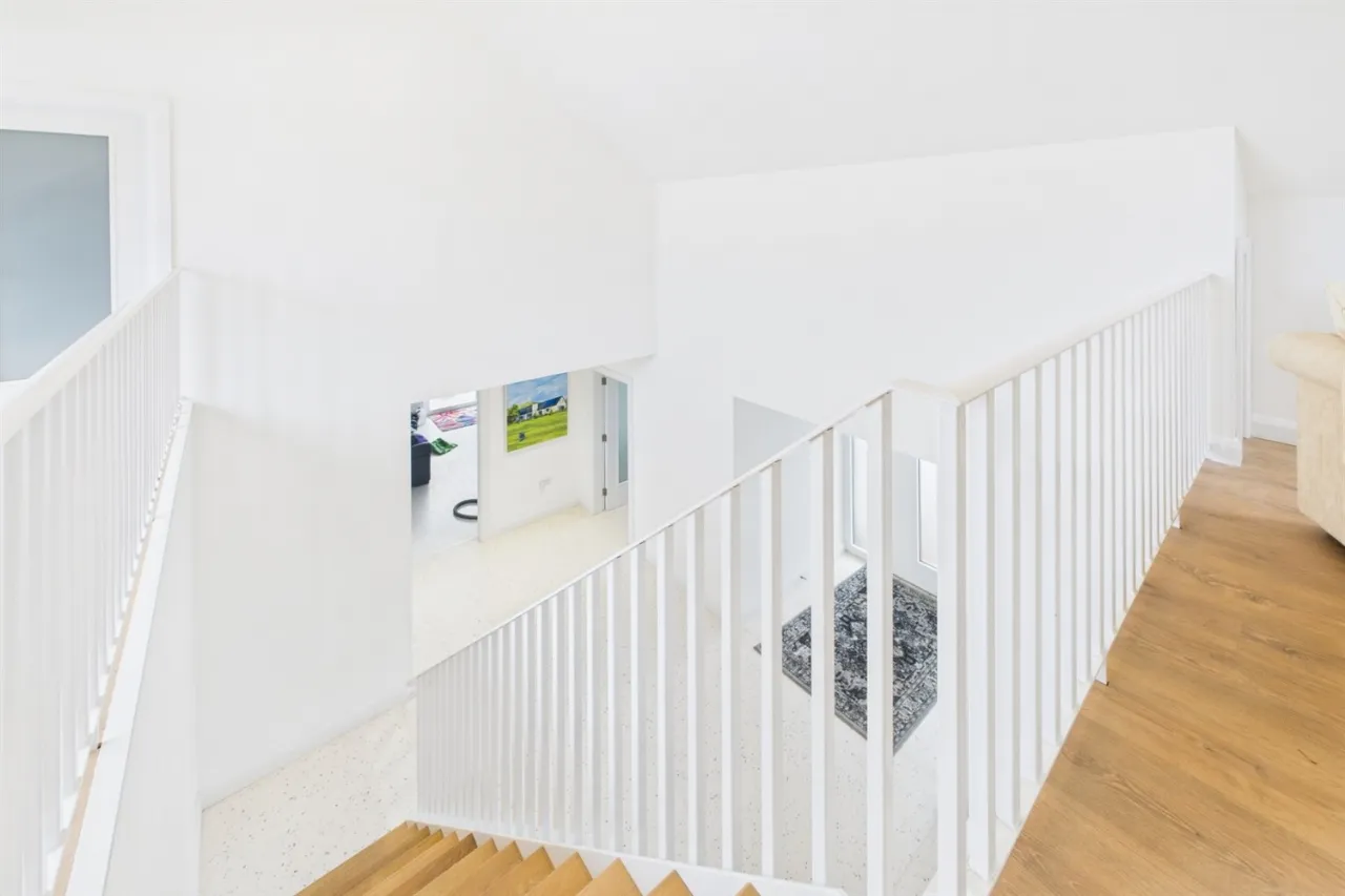 Upstairs comprises a large open-plan landing with balcony and two double bedrooms, both benefiting from ensuite bathrooms.