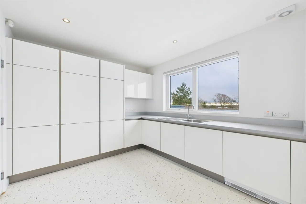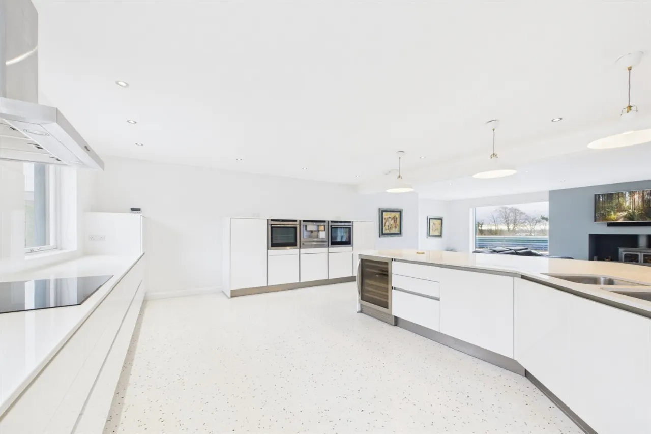 The property offers bright, spacious accommodation throughout. The ground floor features a striking open-plan kitchen, living and dining area with floor-to-ceiling windows overlooking the golf course, a separate living room, double bedroom with ensuite, downstairs WC, utility room, and an integral garage with shower room.