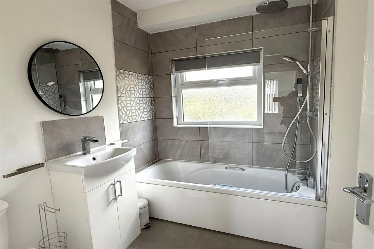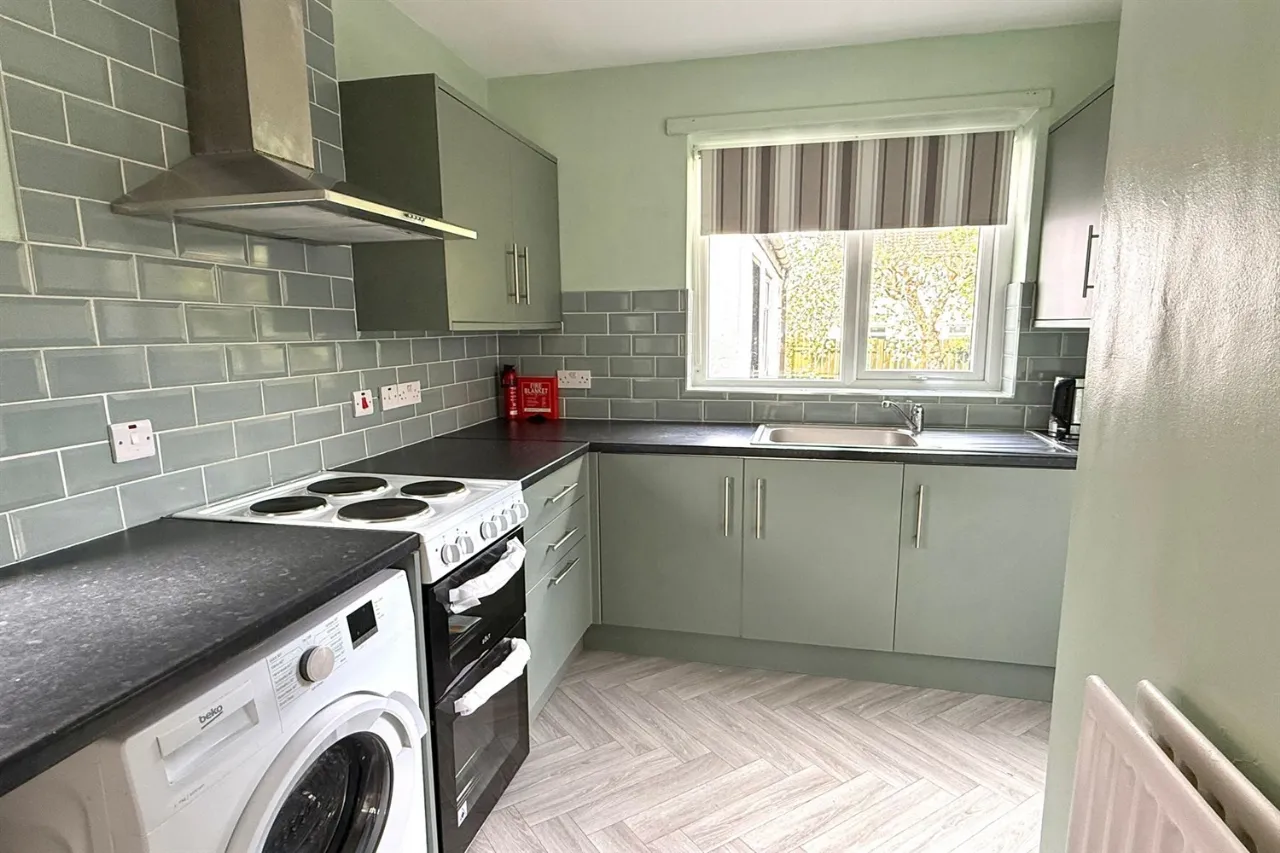 The L-shaped kitchen is fitted with new units in a sophisticated sage green palette and includes modern appliances such as a solid plate cooker, washing machine, and fridge freezer, making it both functional and visually appealing. The modern family bathroom is finished to a high standard with a white suite, chrome waterfall shower over the bath, W.C., wash hand basin set in a vanity unit, and elegant pale grey tiling.
