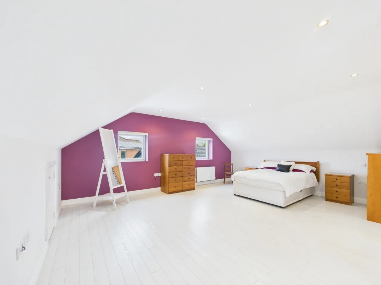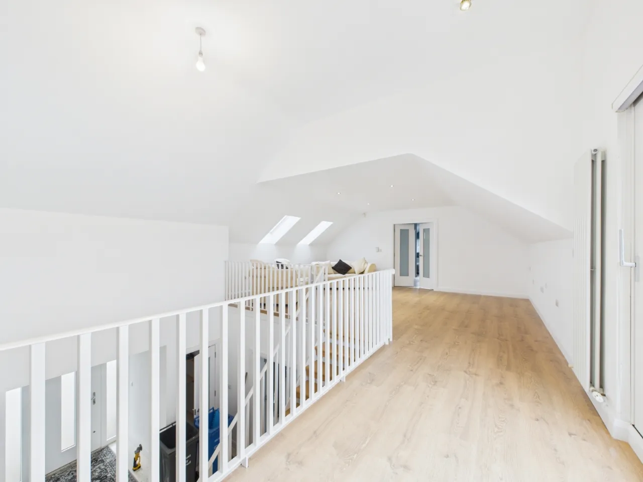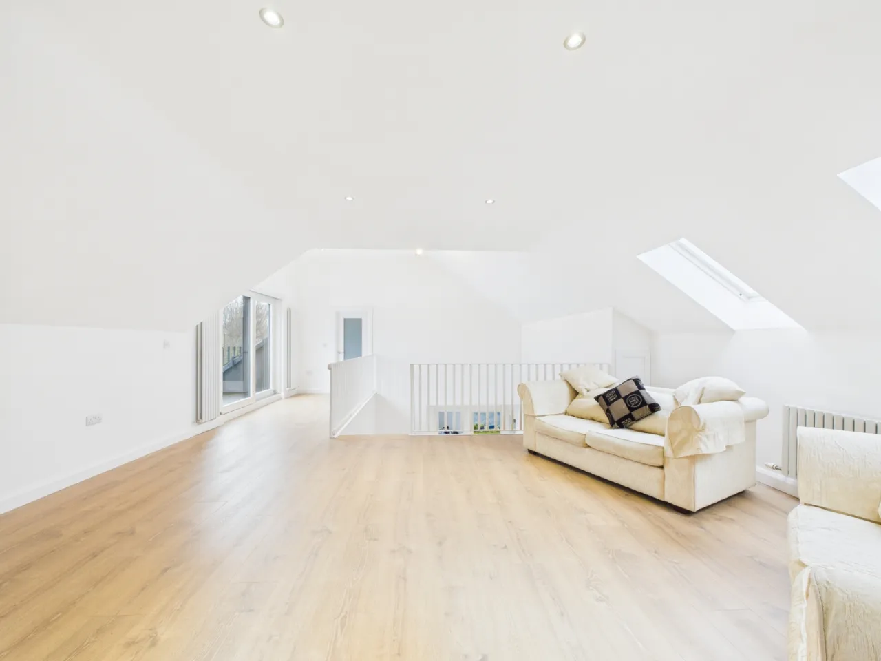 Upstairs comprises a large open-plan landing with balcony and two double bedrooms, both benefiting from ensuite bathrooms.