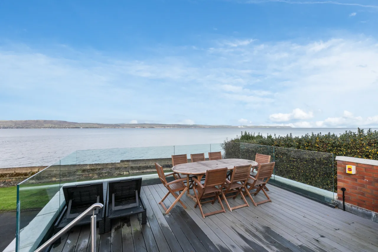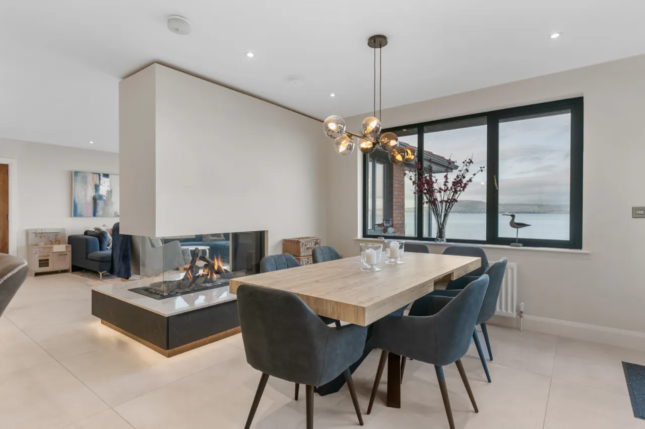 Contemporary double sided gas fire to kitchen and dining, sliding doors to balcony, window seating, panoramic sea views, low voltage spot lights, tiled floor.