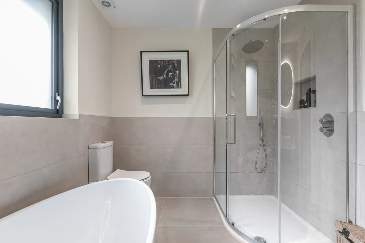 Contemporary suite comprising of low flush WC, freestanding bath with feature chrome mixer tap, wash hand basin with vanity storage, large walk in shower with chrome thermostatic shower unit. Chrome heated towel rail, tiled floor, part tiled walls.