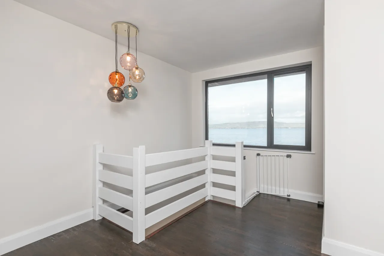 Fitted sliding wardrobes, freestanding bath with feature chrome mixer tap and tiled surround, panoramic sea views. Built in shelving, low voltage spot lights.